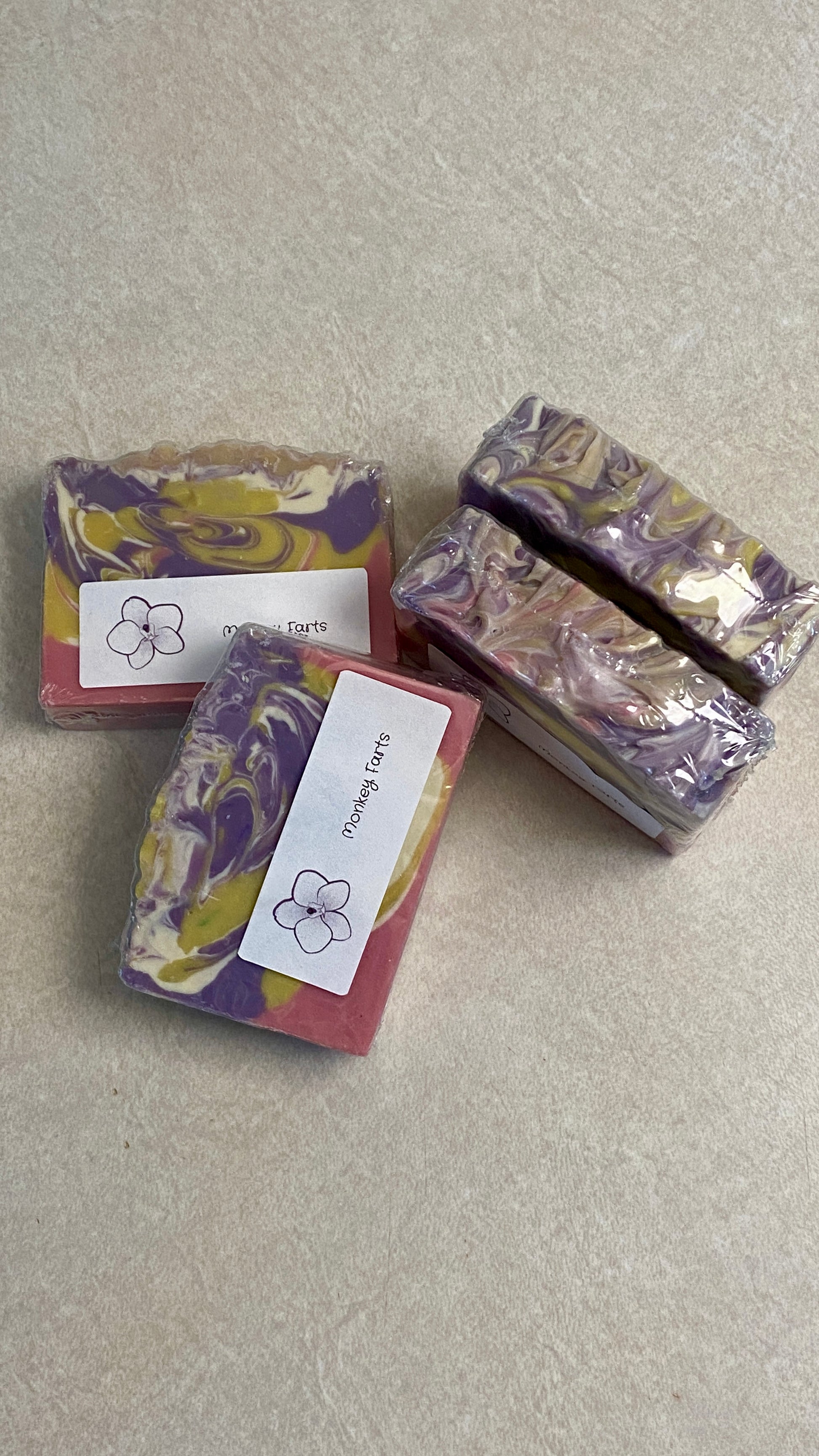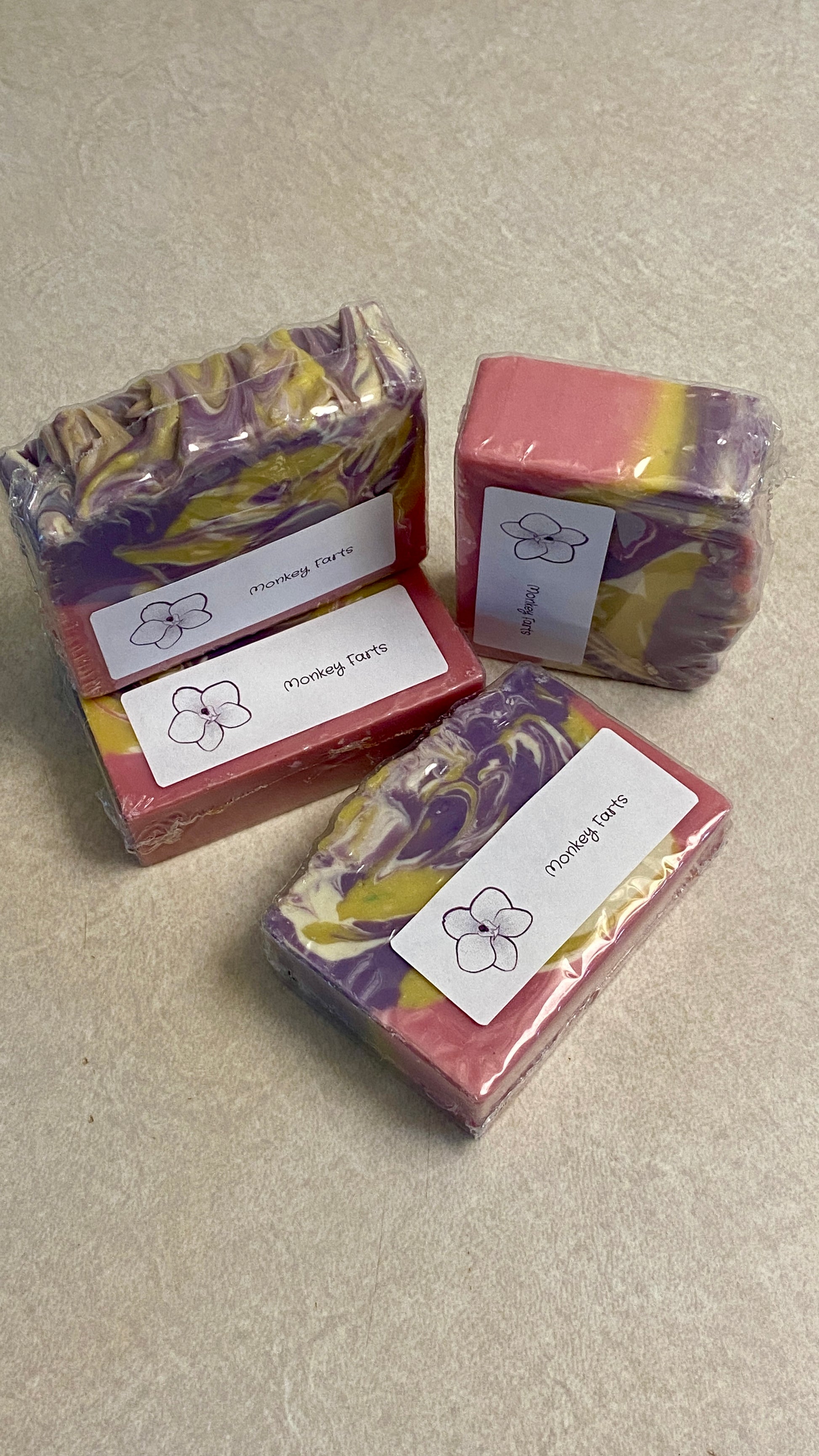 This scent is noted for its fun and whimsical nature. Its reminiscences of a tropical paradise. It will leave you feeling uplifted and invigorated. This cold process soap has a slight citrus kick to it, Its Not your Grandmas Soap. Kids adore this scent as well as many adults. This soap is suitable for all skin types. It's a playful and fruity scent that combines the aromas of bananas, pineapples, and other tropical fruits. It has a sweet and tangy aroma to it. The fragrance is often enhanced with additional notes such as coconut, mango, and papaya, which creates the fun and whimsical scent. It's a popular choice among everyone. It will leave you feeling lively and energetic.